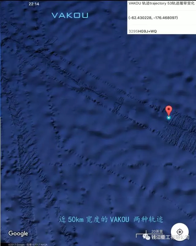 這是日本海溝的VAKOU行動軌跡,在看見這個圖像**初的感覺不是自然形成的,而是在一種設備的行動軌跡,但軌跡的寬度之大確實嚇壞的 我們,15km的機器寬度,我們暫時給這個龐然大物命名為“VAKOU”!